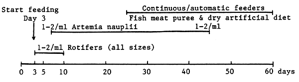 | Source of feeding example cited: Freddi (1985) Temperature: 23°C Salinity: 35ppt incubation/day 10–60, 25ppt hatching to day 10. Larval density: egg incubation 50–70/1 (hatching 90% viability 80%). Survival: 10–15% at end of metamorphosis from egg incubation. | |