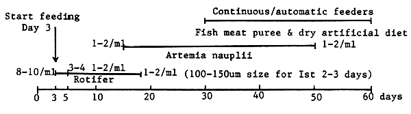 According to Kuronuma and Fukusho (1984) the principles guiding the feeding of larvae in tanks or enclosures, are: