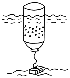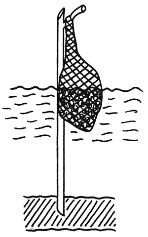 Soft manure is shovelled into a basket of parallel iron rods (approx. 2–2.5cm apart), suspended 10–20cm below the water line, attached to the side of a boat, and dispersed as the boat moves and forces water into the basket (Figure 17, B1).