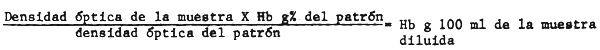 el patrón es una solución de concentración conocida y cuya densidad óptica a los 540 mu corresponde a la de una cantidad determinada de Hb g 100 ml. Es aconsejable emplear patrones comerciales fidedignos para ese fin. La densidad óptica del patrón se determina a los 540 mu al agregar aproximadamente 5 ml a una cubeta y medirla con el espectrofotómetro. Seguidamente se determina la densidad óptica de cada muestra de sangre y el contenido hemoglobínico se calcula conforme a la siguiente fómula: