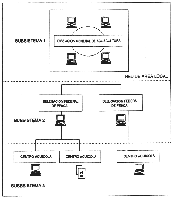 El CNIA se compone por tres subsistemas en niveles jerárquicos de organización, a saber: (1) Dirección General de Acuacultura, (2) Delegaciones Federales de Pesca y (3) Centros Acuícolas (ver apéndice 1). El primer subsistema concentra y consolida la información de los dos restantes.