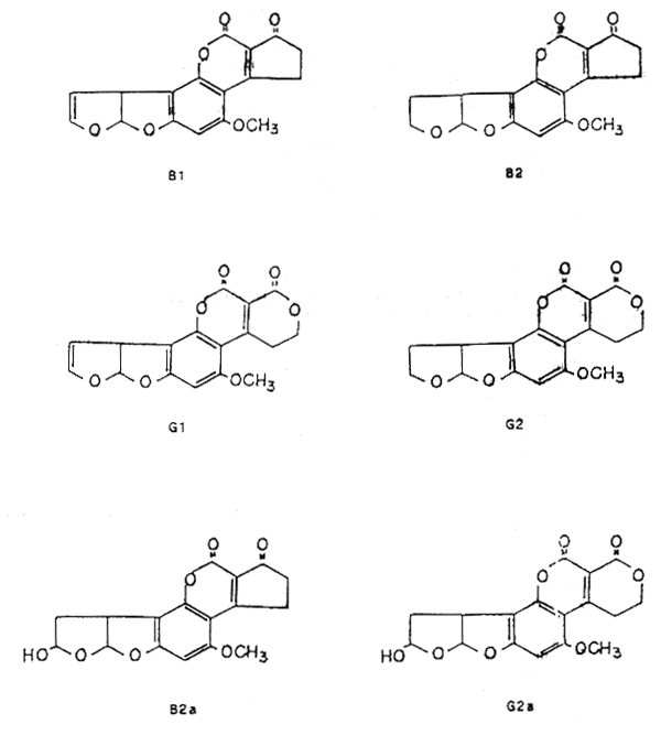Las aflatoxinas más importantes y más estudiadas se han clasificado en los tipos: B1, B2, G1 y G2 según su fluorescencia de color azul o verde en presencia de luz ultravioleta a 365 nm. Existen además, los derivados B2a y G2a.