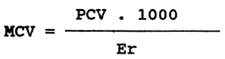 The value of the mean corpuscular volume can be calculated from the haematocrit value (PCV), expressed in 1.1-1, and from the erythrocyte count (Er), expressed in T.1-1. The following formula is used for this calculation: