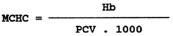 The mean corpuscular haemoglobin concentration expresses the concentration of haemoglobin in unit volume of erythrocytes. It is calculated from the haemoglobin value (Hb) in g.1-1 and from the haematocrit value (PCV), expressed in 1.1-1, according to the following formula: