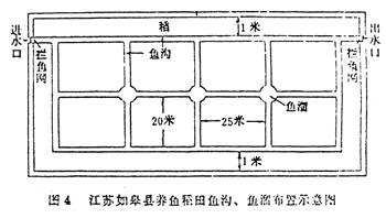 According to experience gained by Zhejiang farmers, sun-drying of rice fields has no adverse influence on fish. For example, in 1959, 5.52 mu of paddy was experimented with fish culture and two crops of consecutive paddy. Cross-shaped fish trenches (40 cm wide, 26.4 cm deep) and 3 sumps (2.33 m length, 2 m wide and 1.16 m deep) were constructed. Transplanting was carried out in April 16 at intervals of 6.6 cm × 16.6 cm. The water depth was about 3.3 cm and fish was stocked 8 days after transplanting. An average of 362 common carp of 6.6–16.6 cm, 1811 crucian carp of 2.3 cm were stocked per mu. At the same time, the field was drained for tillering. After tilling, the field was again filled and further stocked with 2.3 cm crucian carp at a rate of 2,000 per mu. The field was again tilled 5 days and another 7 days after. At each tilling, the field was drained and the fish concentrated in fish trenches and fish sumps. After 3 tillings, the field underwent sun-drying for about 10 days until small cracks in the soil were evident. During sun-drying, the fish were concentrated in the trenches and sumps. To provide food for the fish during this stage, 5 kg of cow dung was supplied to the trenches and sumps at alternate days. The early paddy was harvested on July 12 with an average yield of 491 kg per mu. Late paddy was transplanted on July 13 at intervals of 10 × 20 cm. The field was drained and tilled twice on July 18 and August 7 respectively. The field was then sun-dried for 12 days, during which 21 kg of ammonium sulfate and 2.74 kg of 666 powder were introduced on August 10. As the fish was concentrated in the trenches and sumps, no adverse effect was detected.