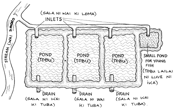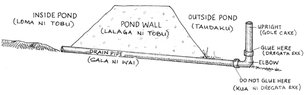 NA TOBU TAUCOKO E DODONU ME NA DUI TIKO NA KEDRA SALA NI WAI KI LOMA KEI NA KEDRA SALA NI WAI KI TUBA. NA TOBU LAILAI KA DAU MAROROI KINA NA LUVE NI IKA E NA RAWA NI KELI VAKAVOLEKA KI NA DUA NA TOBU LEVU SE DUA NA VANUA VAKAVOLEKA. EVERY POND MUST HAVE ITS OWN INLET AND DRAIN. A SMALL POND TO HOLD THE YOUNG FISH CAN BE PUT NEXT TO A BIG POND OR ANYWHERE NEARBY. | |