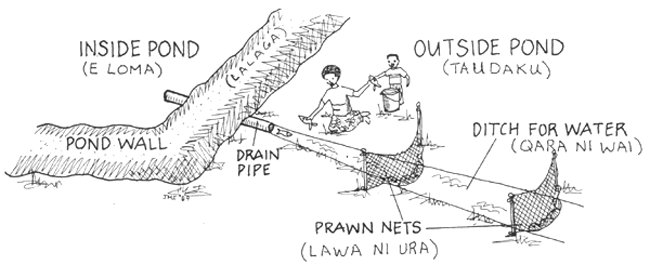 E NA RAWARAWA NA NOMU QOLIVI IRA NA IKA E NA TAUDAKU NI TOBU, E NA I DRODRODRO NI WAI KI TUBA. DOLAVA NA PAIPO ME NA RAWA NI SALA MAI KINA NA WAI KEI NA IKA. BIUTA E RUA NA LAWA NI URA ENA VANUA KA DRODRO TIKO MAI KINA NA WAI ME RA NA COKO KINA NA IKA. IT IS EASY TO CATCH THE FISH OUTSIDE THE POND, IN THE DRAIN. OPEN THE PIPE SO THE WATER AND THE FISH CAN GO THROUGH. PUT TWO PRAWN NETS IN THE DRAIN TO CATCH THE FISH. | |