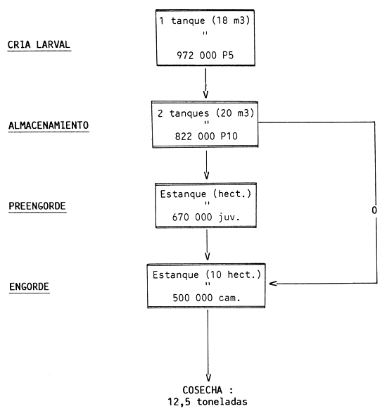 Producción teórica 5.106 larvas/tanques y ciclo, 2 × 4 tanques de hormigón de 170 m3.