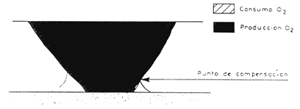 En un estanque, la fotosíntesis debe producir más 02 que lo que se consume. Sin embargo, la cantidad de 02 producido por el fitoplancton disminuye con la profundidad. A cierta profundidad la producción de 02 es igual al consumo. Esta profundidad se llama “punto de compensación”.