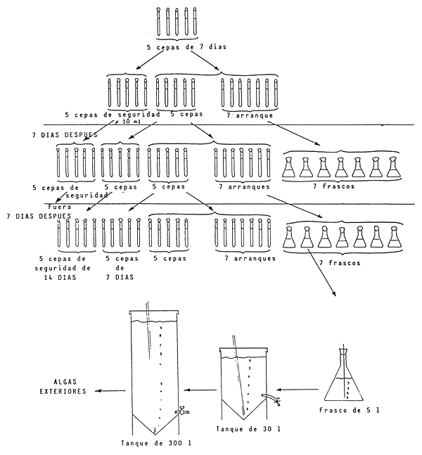 Después de 4 días de crecimiento en los frascos de 250 ml, este volumen pasa a 3 litros ; 4 días ---- 30 litros, así hasta los tanques exteriores de 1 m3 (Chaetoceros, Isochrysis).