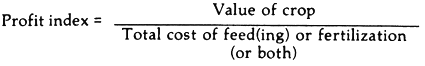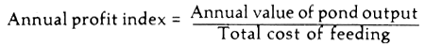 There is another important factor which governs the farmers' choice of feed which is not reflected in the equations illustrated, which is close to what we refer to as growth rate but actually also takes into account the down-time in the grow-out structure (pond, cage, etc.). Survival rate has already been taken into account in the Profit Index mentioned above. The farmers also need to know how often he can produce marketable fish or shrimp per year. How many marketable crops per year? Following on from that, what is the annual value of the harvest generated by a particular feed, not just the crop value. So I think the most accurate, though simplistic, way of expressing the criteria by which feed performance could be measured in a manner utilizable by the farmer is what I have called the Annual Profit Index.
