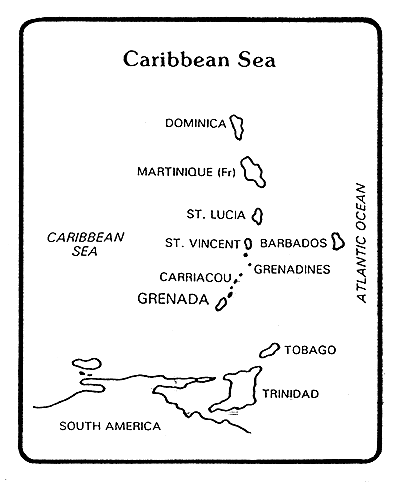 Grenada island (344 km2), the most southerly of the caribbean windward islands, is about 241 km southwest of Barbados and 145 km northwest of Trinidad. The State of Grenada also includes the 2 Carriacou and Petit Martinique islands (respectively 35 km2 and 2 km2).