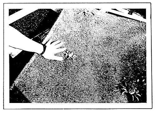 Few hours after metamorphosis, the megalops are transferred to a juvenile crab grow-out cage. That cage is suspended in the water column beneath the water surface. As the animals are hervivorous, grids covered with algae are frequently added in the cage while the former are removed. After 100 days, the young crab bodies are 15 mm in diameter.
