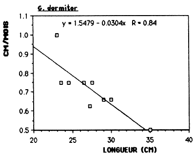 Lorsqu'on ne peut pas tracer des courbes de croissance continues (comme aux figures 5, 6 et 7) ou lorsque qu'on ne dispose que de données marquages-recaptures, il n'est pas possible de leur appliquer la méthode de Ford Walford. Dans de tels cas, la “méthode graphique de Gulland et Holt” peut être d'un grand secours: elle donne des estimations de L∞ et K à partir du fait que:
