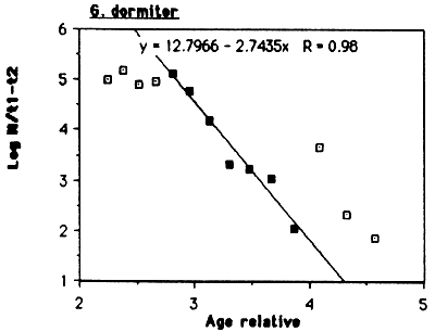 Une autre méthode pour estimer Z consiste à échantillonner une population comportant plusieurs classes d'âges, puis à tracer le logarithme népérien (loge) du nombre de poissons dans l'échantillon (N) en fonction de leur âge t respectif d'où on a: