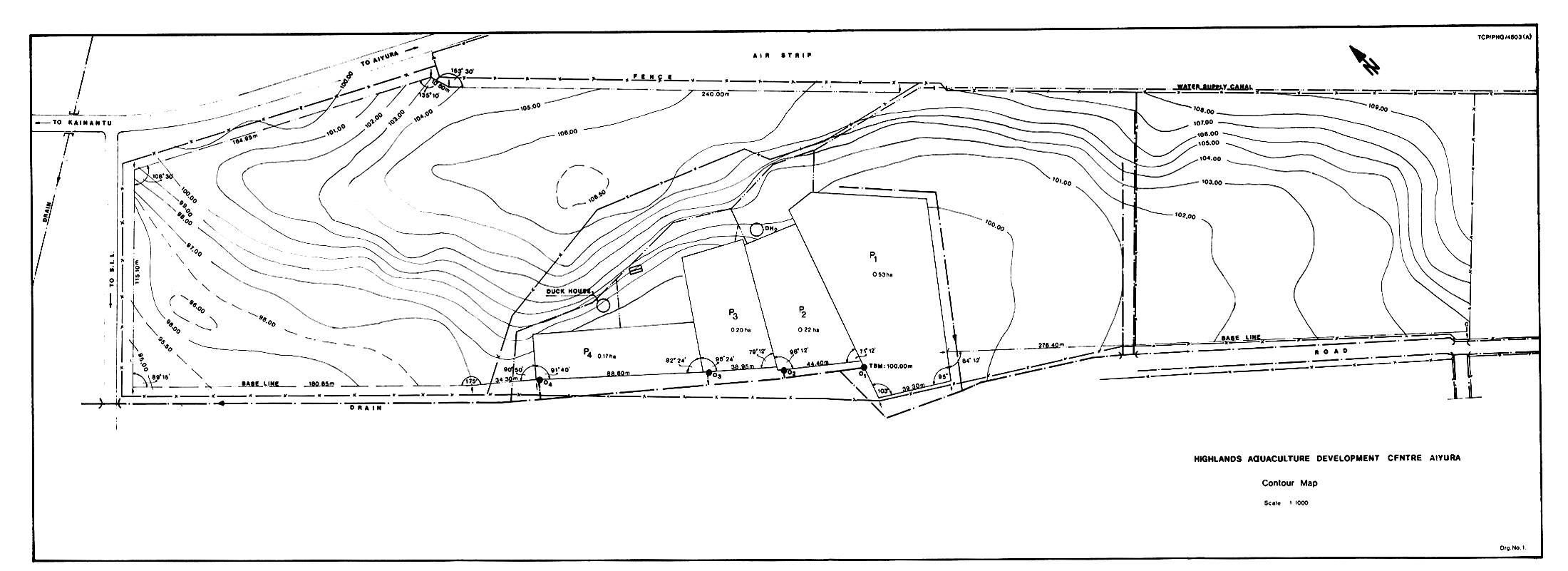 According to the topographic survey carried out, the contour map including the existing ponds is shown in Drawing No. 1. The local temporary Bench Mark (TBM) with an elevation of 100 m is the top of the tower of the outlet structure in the existing pond Pl.