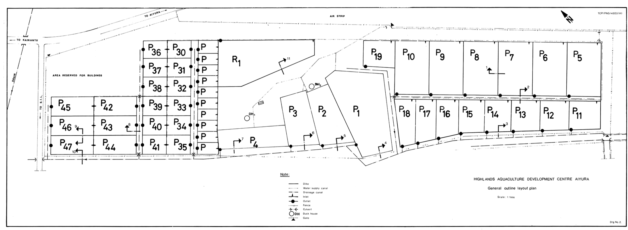 The centre is situated about 11 km southsoutheast of Kainantu, to which it is connected by road. Kainantu itself is 2 hours by road from Goroka and 4 hours from Lae. The fish ponds of the centre are located along the airstrips. Airstrip elevation is about 1 620 m (see Fig. 1).