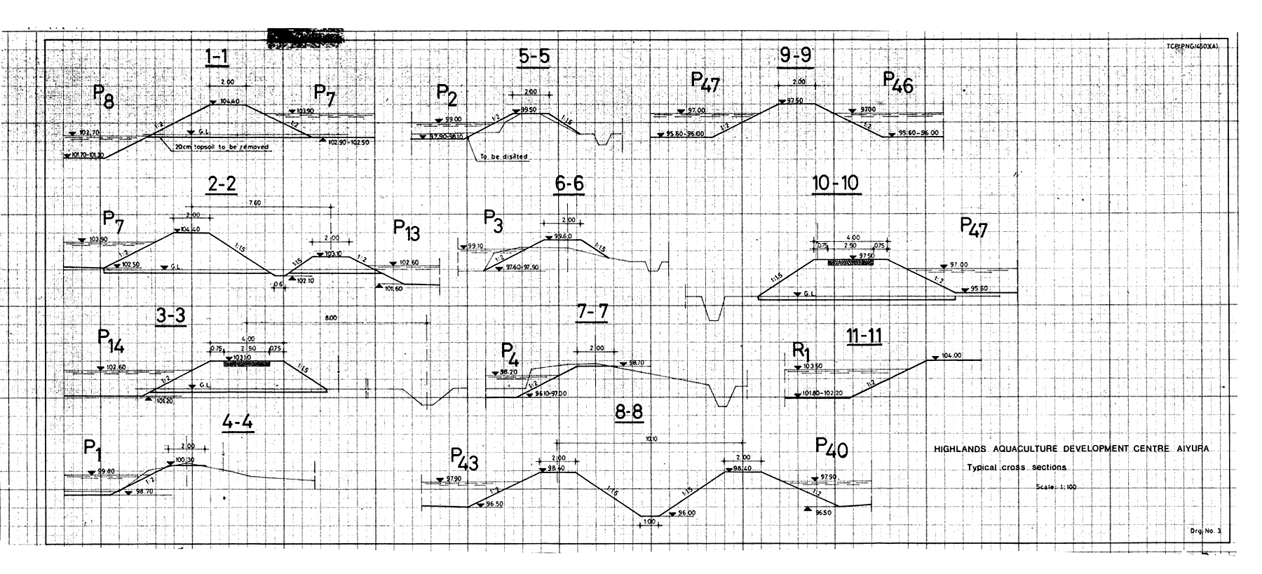 The general outline layout plan (Drawing No. 2) includes a reservoir of 0.45 ha and four existing ponds of 1.12 ha and 43 new ponds having a water surface area of 4.25 ha of various sizes (Table 1) and the area reserved for the buildings (new hatchery, laboratories, stores, staff quarters, training centre with hostel and classroom, etc.) will be built in the future.