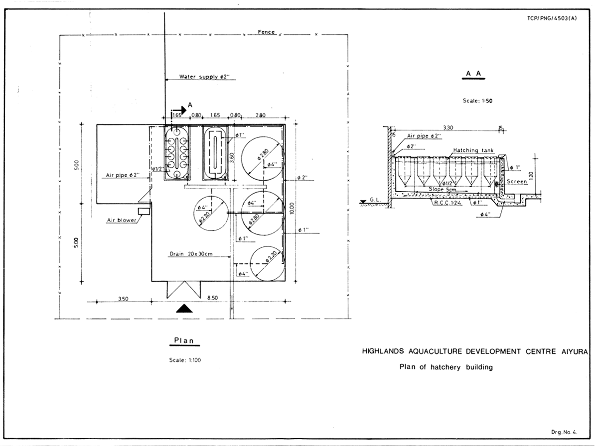 The hatchery building was built in the centre of Highlands Agricultural Experimental Station, Aiyura 1.5 km from the fish ponds. The plan of the hatchery building for its improvement is shown in Drawing No. 4. According to this plan the following improvements are recommended: