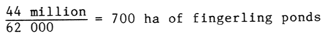 Up to this stage, the fish have been grown in monoculture. However, for growing-on over the first summer and producing fingerlings, the species are stocked together in polyculture. If the average stocking density is 62 000 fry/ha, 44 million fry need a total area of