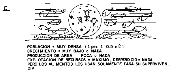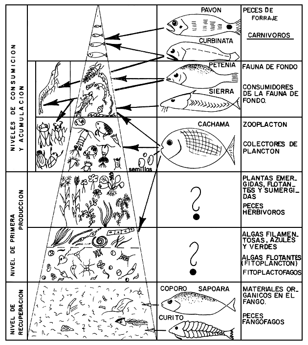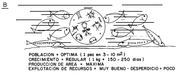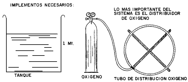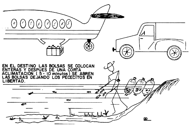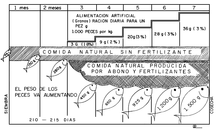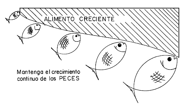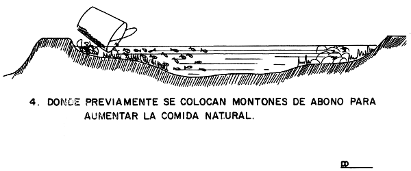 Se pueden poner hasta un millón de alevinos por hectárea en los tanques de cría. Después de 3 o 4 semanas la densa población de pecesitos debe ser colocada en lagunas grandes para su - total crecimiento.-