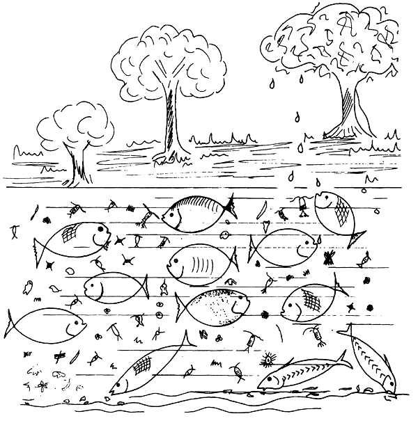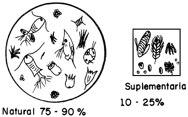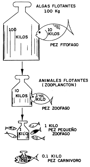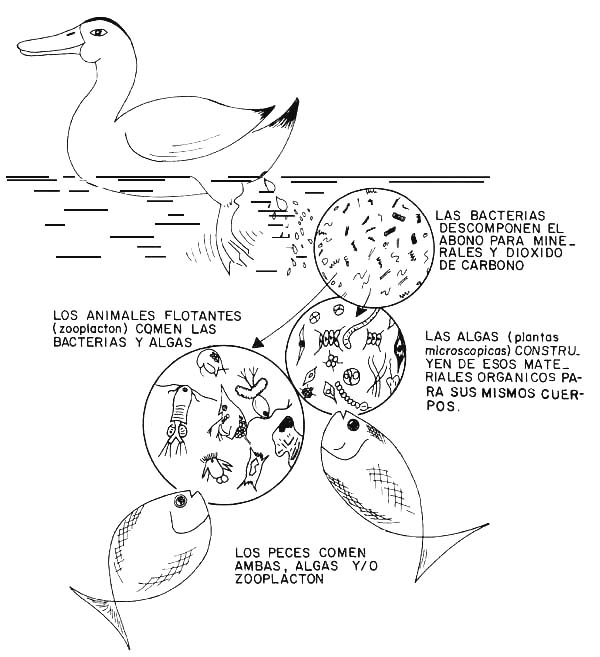 En un estanque de piscicultura, como en todo depósito natural de agua estancada, como los lagos, lagunas, etc., los “productores” más importantes son unas algas muy pequeñas que, por medio de la fotosíntesis y otros procesos biológicos, acumulan las materias orgánicas (proteínas, grasas, carbohidratos, vitaminas, etc.) que contiene la carne de pescado.