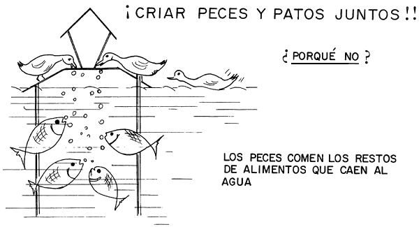EL PATO DISTRIBUYE SU ABONO DIRECTAMENTE EN EL ESTANQUE MEJORANDO ASI LA PRODUCTIVIDAD DEL AGUA. EL PEZ COME EL DESECHO DEL ALIMENTO DE PATOS. TIENE UN SANO MEDIO-AMBIENTE