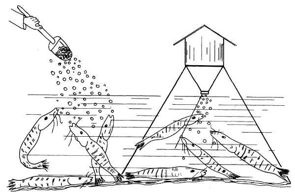 Si más tarde o más temprano el estanque ha de poblarse con camarones, que también constituyen un manjar exquisito, tunto para el hombre como para los peces, algunas veces es necesario sembrar unos cuantos camarones grávidos (adultos) en el estanque. Esto debe hacerse temprano ya que estos serán habitantes muy útiles del estanque.