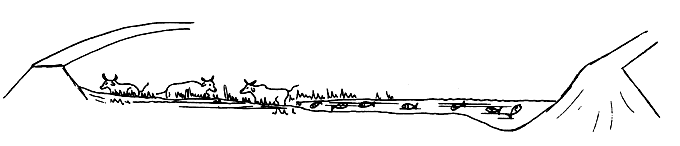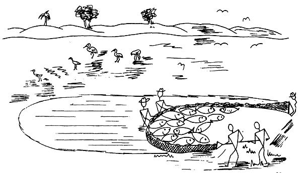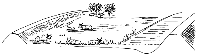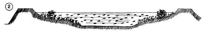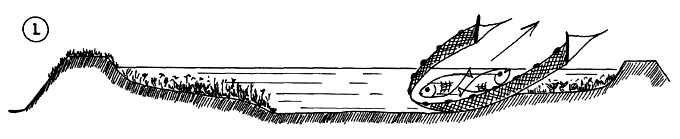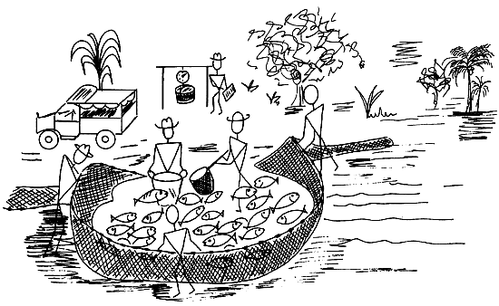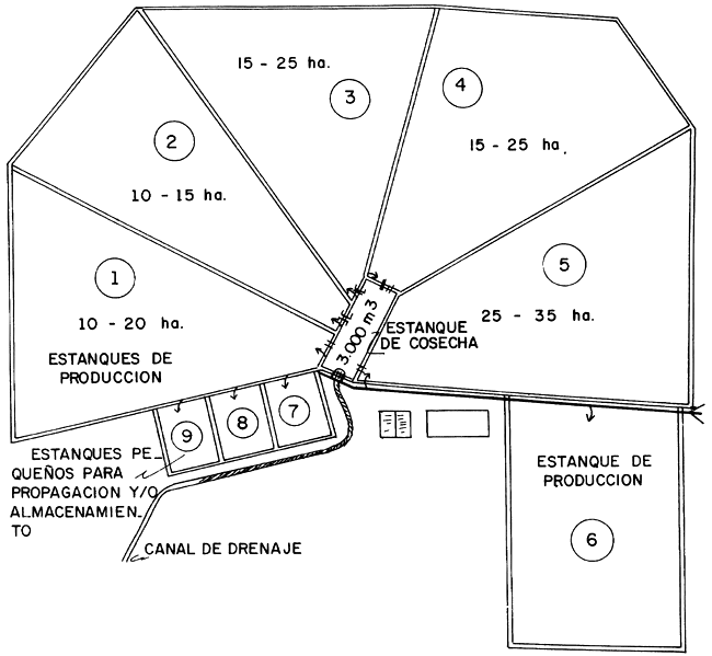 Aquí se ofrece un esquema para una granja piscícola en los LLanos. La zanja trae el agua al centro de la granja y el drenaje,-así como la cosecha, se realizan mediante un estanque de cosecha contiguo que tiene un metro mas de profundidad y se ha excavado a nivel del fondo de los estanques de producción.