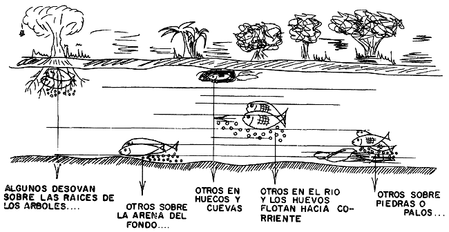 Se sabe que la mayoría de los peces de importancia económica desovan en los ríos durante la época de las lluvias. Los huevos son llevados por los ríos corriente abajo.