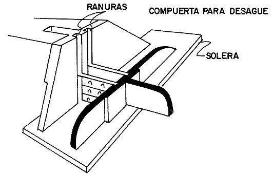 Para un estanque de más de una hectárea se pueden usar dos tubos de plástico (de 8 pulgadas) o bien construir un monje como se indica en el dibujo. Lo más importante del monje es que los dos pares de ranuras sean paralelas, ya que de otro modo no podrán colocarse las tablas de control.