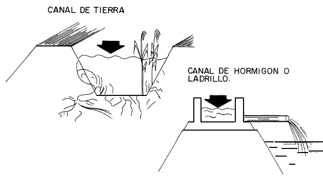 | EROSION: Peligro Frecuente INFILTRACION: Hay PERDIDA DE AGUA A TRAVES DE AGUJEROS DE TERMITAS CANGREJOS ETC.: Puede ser frecuente MANTENIMIENTO: Necesita con frecuencia DURACION DEL CANAL: Corto tiempo CIRCULACION DEL AGUA: Lenta CONSTRUCCION: Económica | EROSION: No Existe INFILTRACION: No hay PERDIDA DE AGUA: No Hay MANTENIMIENTO: Poco DURACION: Largo tiempo CIRCULACION: Rápida CONSTRUCCION: Cara | |||