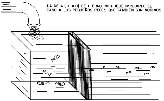 Para los estanques se necesita agua limpia libre de larvas y peces indeseables o perniciosos. Todas las aguas naturales de la-tierra están habitadas por esas especies indeseables. Por consiguiente el agua debe filtrarse antes de que entre en el estanque para impedir la entrada de esas especies dañinas. Los caribes y guabinas pueden hacer mucho daño en el estanque. No hay que olvidar la necesidad de proteger el negocio.