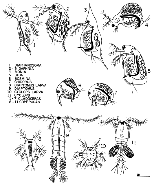 El alimento animal más importante en la columna de agua del estanque piscícola es el crustáceo. Son las principales fuentes de proteínas de muchos peces que se alimentan de ellos, como la cachama, el morocoto, etc.
