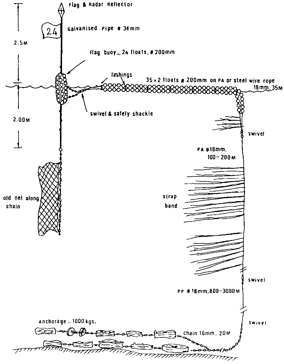 The heavier FADS were constituted of twenty-six 280 mm diameter and five 200 mm diameter high resistance floats strung on an 11 mm diameter steel wire rope. The mooring was 16'mm "diameter polypropylene.