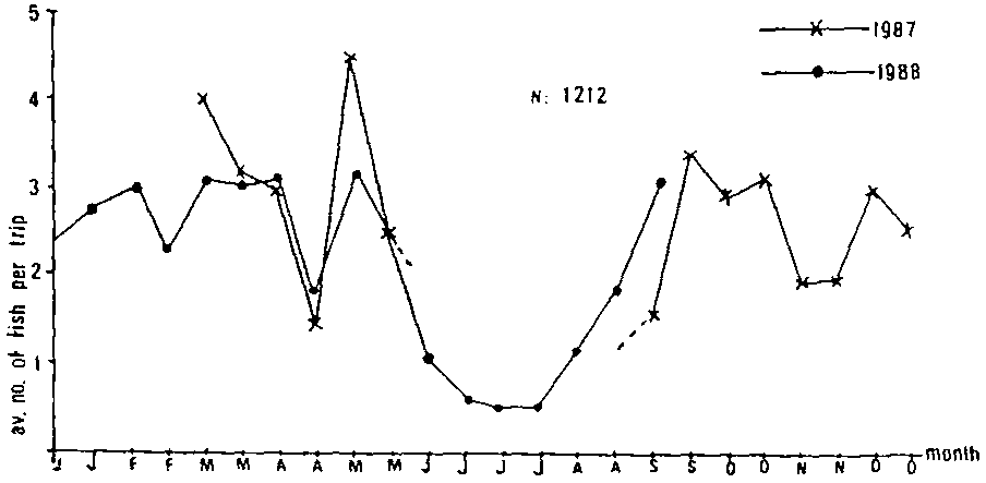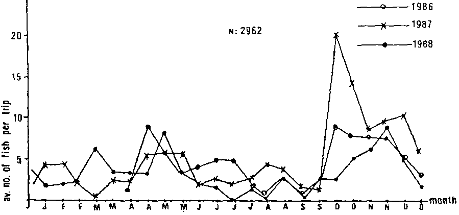 Fig. 3 - Seasonal fluctuation îf catch project boats after ROULLOT et al. (1989)