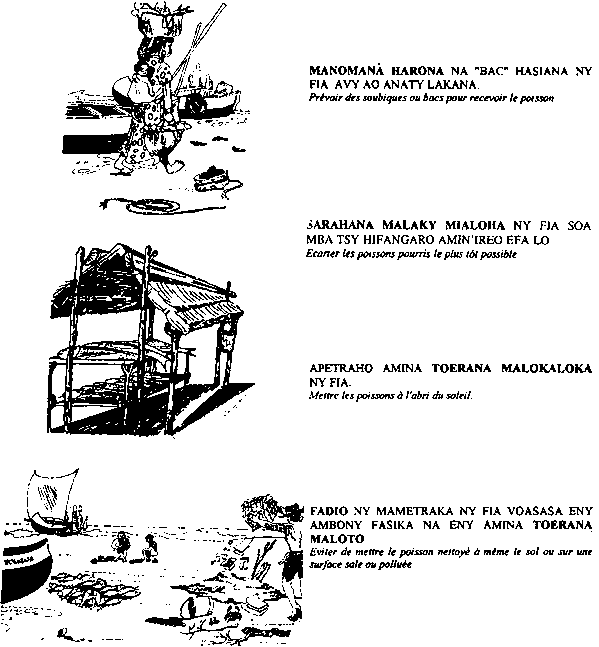 - la formation des pêcheurs, mareyeurs et mareyeuses aux techniques de traitement;- l'amélioration de l'hygiène générale et la vulgarisation de tablettes de préparation du poisson;