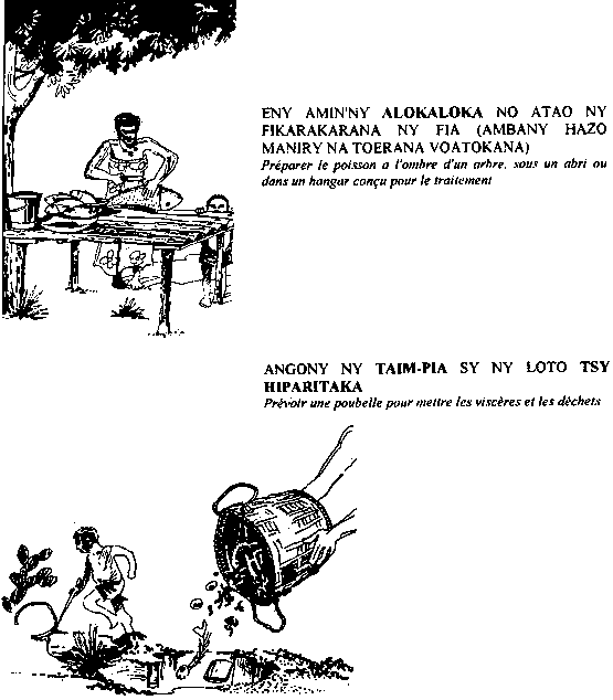 TOERANA ARA-PAHASALAMANA SY FITAOVANA MADIO MANDRAKARIVA NO IKARAKARANA NY FIA (a) - Travailler toujours dans un environnement sain et utiliser du matériel propre pendant le traitement du poisson (a)