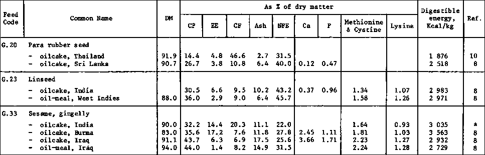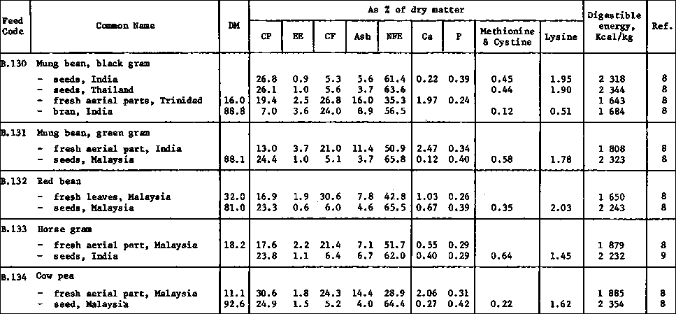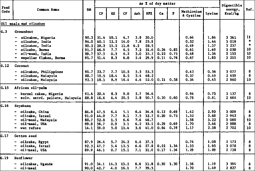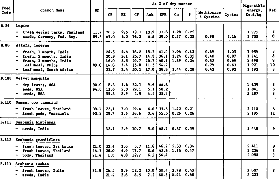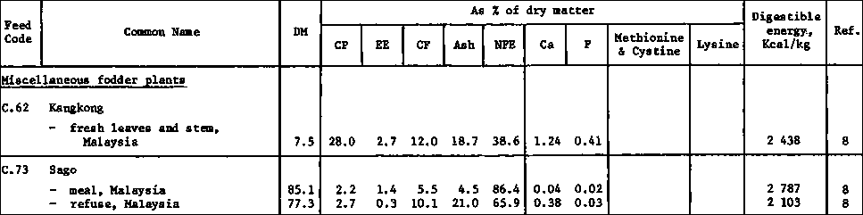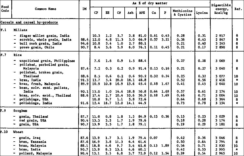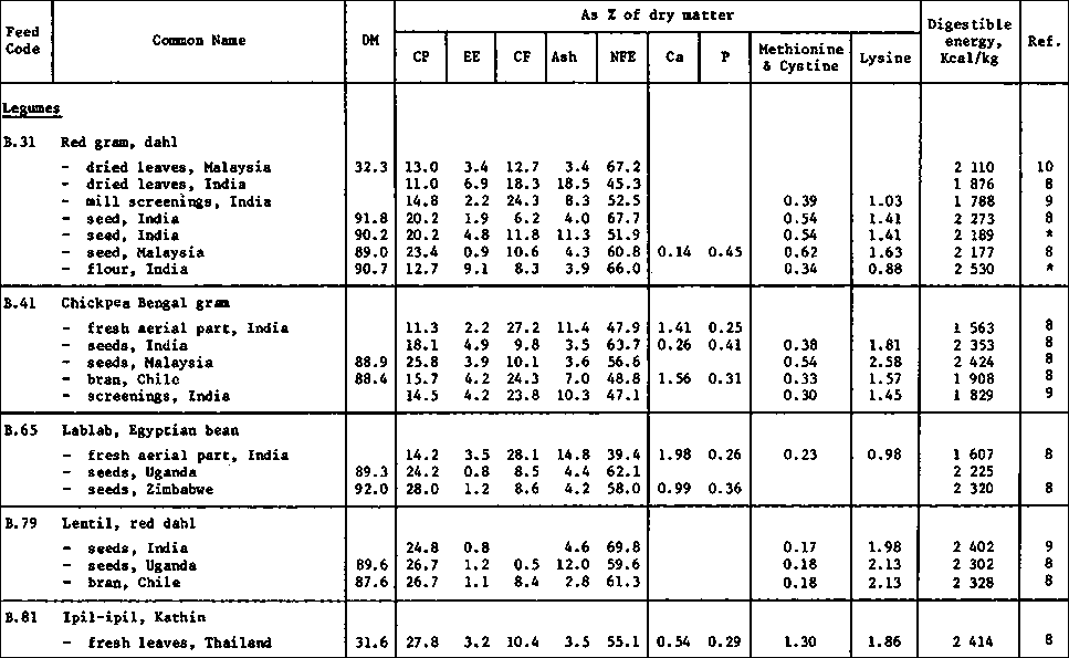 The feedstuffs described below represent the broad spectrum of feed raw materials known to be available among the twelve countries covered in the survey. Some feedstuffs are indigenous to a few countries and are not available even as imported items elsewhere. Others such as rice bran are widely available. Because the quality of the same feed material is expected to vary from country to country, indeed among different production sources within a country, there is no single set of compositional analysis that can be generally applied in the feed formulation process. The data reported in the Table of Composition of Feedstuffs in this section were drawn from major published sources (Göhl, B., 1980; Sen, K.C., 1978; Devandra, C., 1979; Oyenuga, V.A., 1968; McDowell, et al., 1974) and represent average values for feedstuffs from the respective regions. Only in one instance (in Orissa, India) was it possible to carry out actual chemical analysis on a variety of indigenously available feedstuffs. The results of those analyses are included in the table.