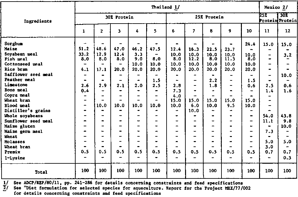 1/ Formulations performed on IBM 370 computer at ALBAMEX, using MPSX software package.2/ Constraints provided by author. For full explanation of RHS, Ranges and Bounds, see Chow, K.W. et al, 1980. Linear programming in Fish Diet Formulation. In Fish feed technology, ADCP/REP/80/11, 241-86, FAO, Rome.