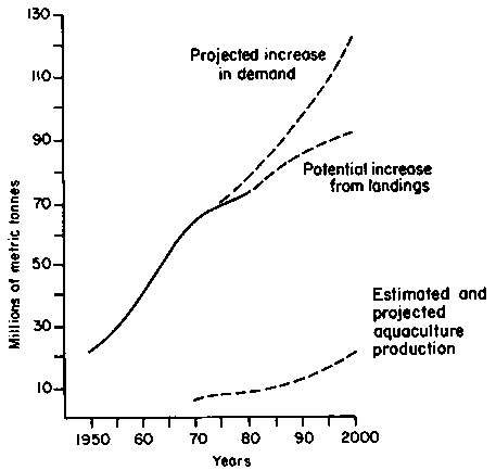 Assistance can contribute usefully to these economic objectives and help meet the growing world demands for fisheries products (Figure 1). Many recent documents on the aquaculture industry, such as the 1984 World Bank report (A Review of Bank Experience with Fisheries Development), and the FAO Circular No. 343 (The Potential of the Fisheries to Provide Increased Food Supplies for the Developing Countries and the Requirements for Investment), state that the future growth of aquaculture and its successful establishment as a viable global industry are dependent principally on the continued effective application of financial assistance and of private investment rather than on other factors such as advances in technology.