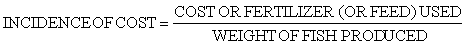The AFCR is a way of comparing two feeds used in similar circumstances. However, several other factors or also important. The first is the relative cost of the two feeds. Thus, if diet 'A' gives an AFCR of 2:1 it may appear better than diet 'B', with an AFCR of 2.5:1. However, if diet 'B' costs 75% of diet 'A' it is obvious that, economically, diet 'B' is better assuming that all other factors are the same. Putting numbers on this example, let us assume that diet 'A' costs US$ 1.20/kg and diet 'B' US$ 0.90/kg. Then, to produce 1 kg of fish with diet 'A' will cost 2 × US$ 1.2 = US$ 2.4 whereas the production of 1 kg of fish with diet 'B' would cost 2.5 × US$ 0.9 = US$ 2.25. Thus diet 'B', though it has a poorer AFCR, is more economical to use. What we have arrived at here, comparing the product of unit feed cost and AFCR, is the same as the INCIDENCE OF COST used by Vincke (1969) and mentioned earlier in section 2.4.2: