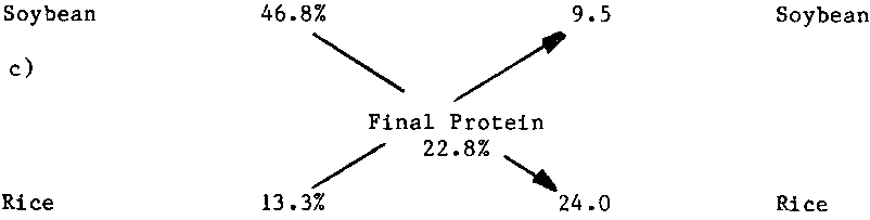 For the example, I am assuming that the formulator (nutritionist) has made up his mind, from past experience, that mermaids must have a minimum of 10% fish meal in their diet. The inclusion level of this ingredient in the diet is therefore fixed - the fish meal will thus contribute 0.6% lipid, 5.5% protein and US$ 60/kg to the final ration respectively. This can therefore be entered on the diet formulation worksheet (Table 18). Having defined (for this example) that there shall be only two other ingredients, the nutritionist decides to select one high protein ingredient (groundnut or soybean) and one low protein ingredient (rice bran or maize meal). This is because it is already obvious to him that the dietary protein requirements for mermaids cannot be matched if all three ingredients are high in protein or if the remaining two, after fish meal (at a fixed level of 10%), are low in protein. This can be demonstrated as follows. The dietary protein requirement is 26%. The fish meal, at 10% of the diet, will provide 5.5% protein to it. If the remaining 90% of the diet consists of either maize meal (9.8) protein) or rice bran (13.3% protein), or any combination of the two, the final protein content of the diet cannot be high enough: