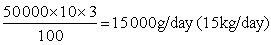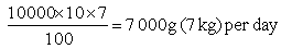 The quantity of feed to be given to a pond or cage each day should normally be based on a percentage of the biomass present (total weight of animals). Thus, if a pond contains 10 000 fish weighing 10 g on average and the recommended feeding rate (see later) is stated to be 7% per day, the amount of feed to be given daily is: