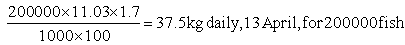 Suppose, on 13 April, there are 200 000 fish present in the pond. Their feeding rate was last determined on 1 April, when the fish were 9.07/kg per 1 000 fish (or 1.45 cm in length) 1/. We wish to adjust the feeding rate again now, knowing from past records that at this operating temperature, the average length increase per day (A) will be 0.0075 cm during April and the expected FCR is 1.2.