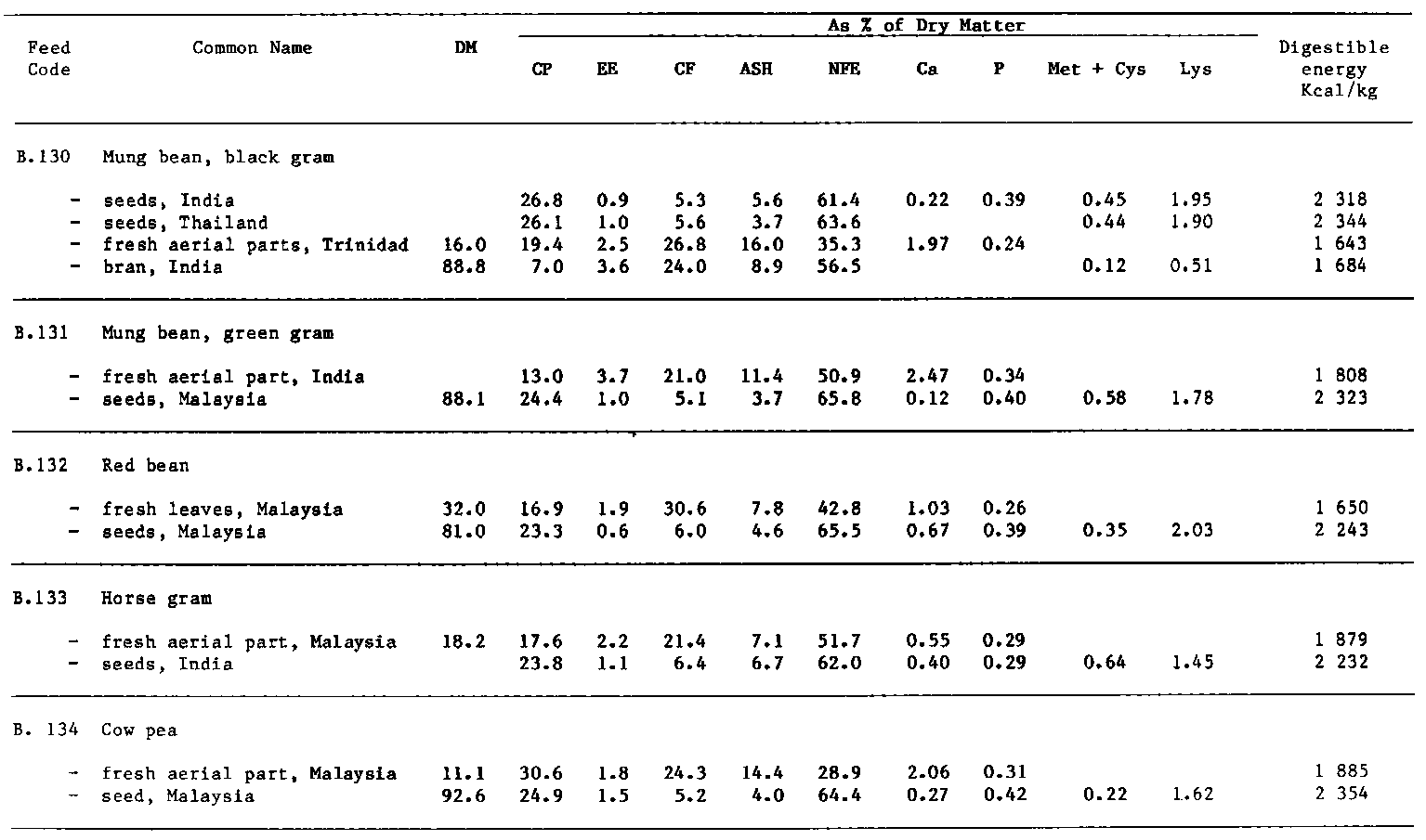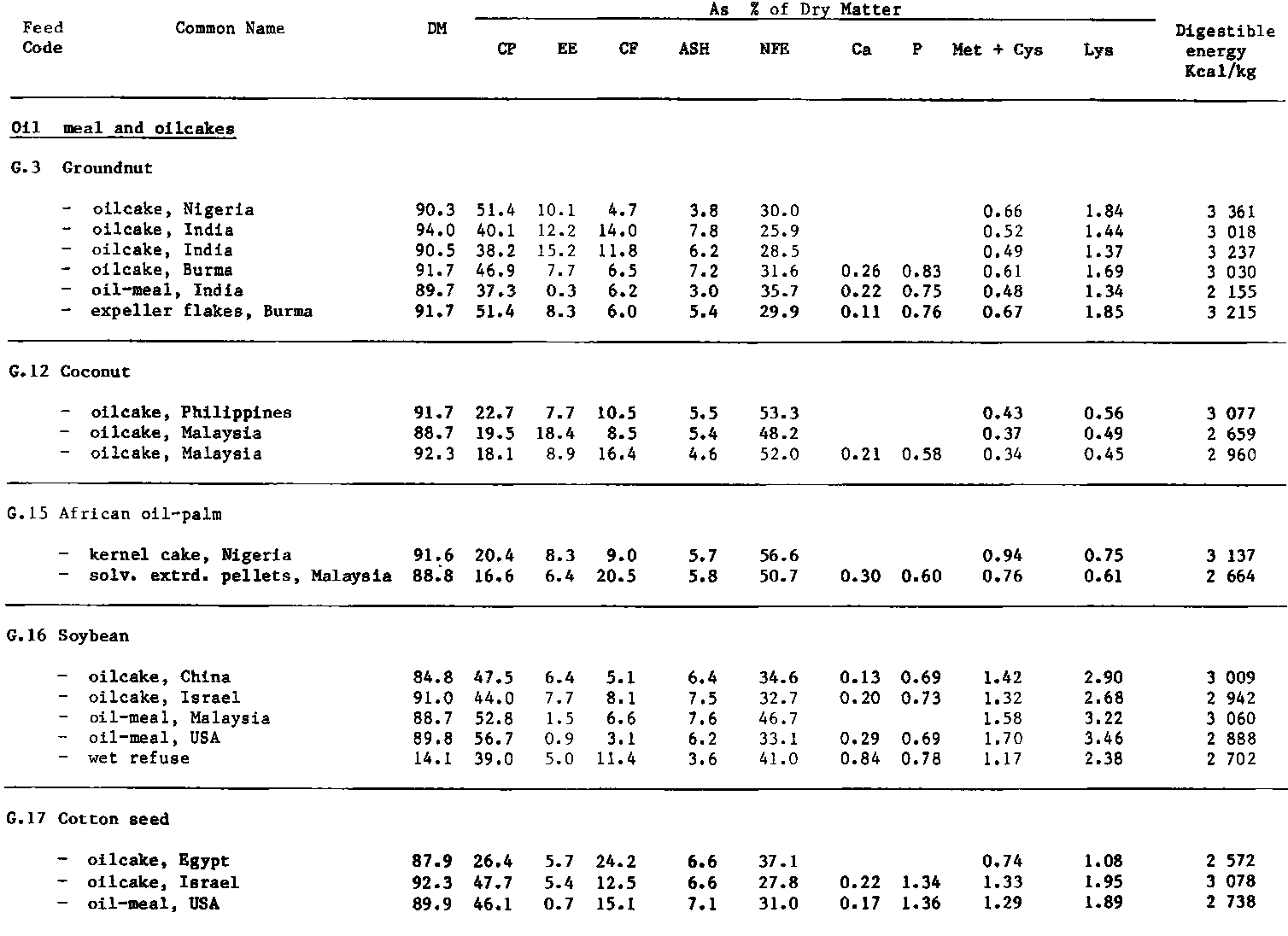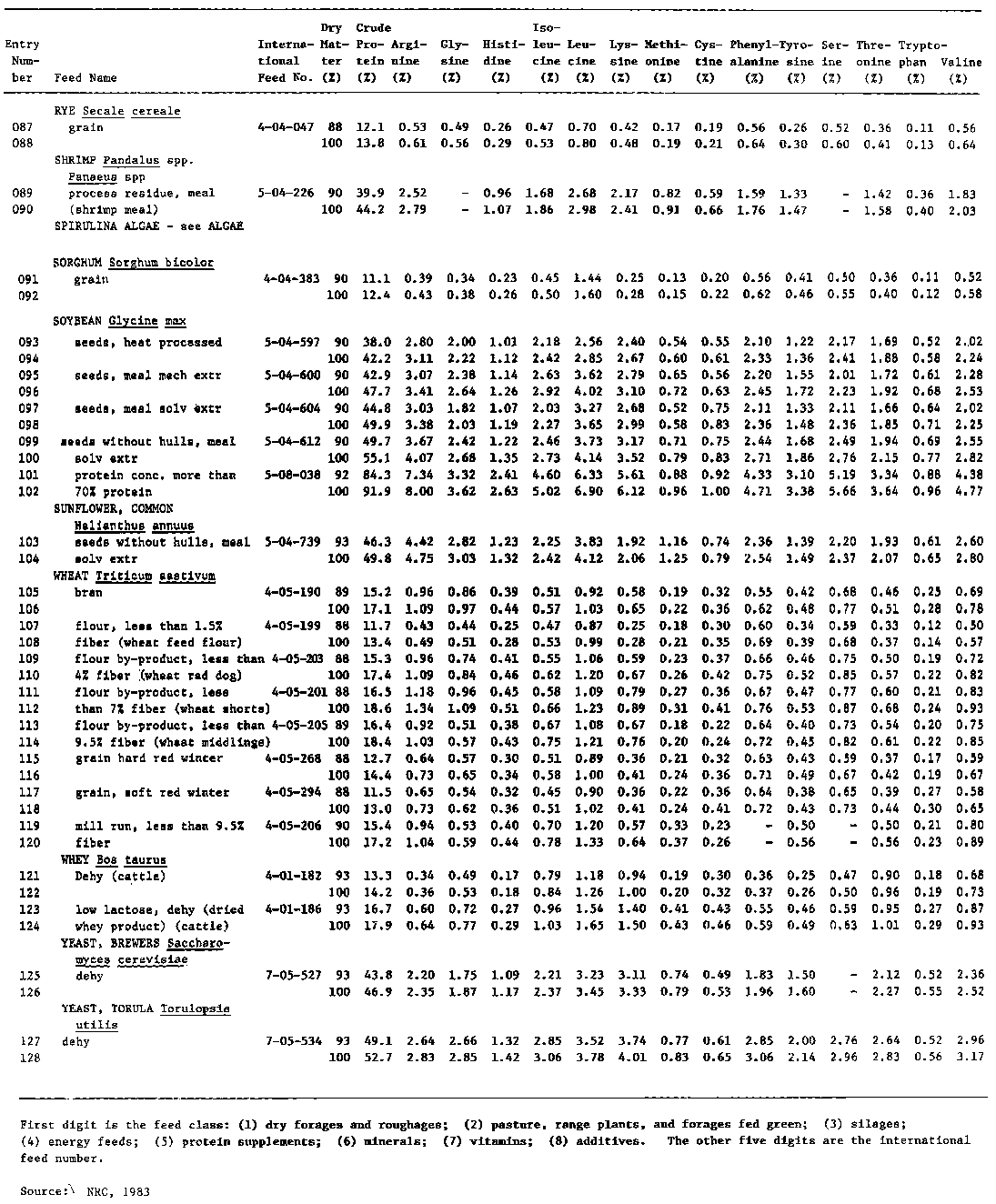 At the end of this appendix, tables for amino acid composition, extracted from NRC (1983) have been provided. Seperate figures for lysine and methionine plus cystine are also given in the first set of tables.