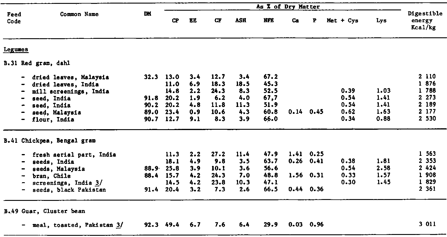 The tables which follow give data for proximate composition, calcium and total phosphorus, and digestible energy.