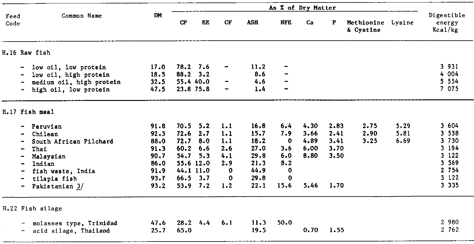 The feed compositional tables provided in another FAO Document (ADCP, 1983) are reproduced here, with a few additions. These tables are only a preliminary guide to the subject. Further, more detailed, tables are discussed and referenced in section 3.2.2. of this manual.