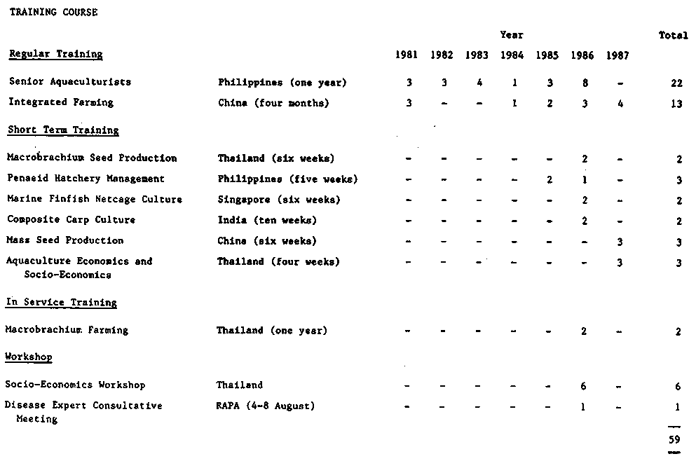 Table 1(A) indicates the number and percentage of all women participants by year and by country for three of the FAO training centres; the data of NACA are included in Table 1(B). At ARAC, 18 of 131 total participants (13.7%) have been women. Of these women, half (9) participated in the sixth course in 1986. In this last course, women comprised 30% of total participants and indicated a dramatic increase in women's participation compared with previous years. At CERLA, 13 of 70 (18.6%) were women. These data were for the 1982, 1983 and 1984 sessions. The 1985 session was postponed and data were not available for the 1986 session. MEDRAP has held three 8-month training courses for aquaculture technicians in Policoro, Southern Italy. Of a total of 67 participants over a three year period, only 4, or 6%, were women even though women from all Mediterranean countries were asked to participate. More women participated in short (1-2 weeks) training sessions on specific topics at a higher level. Topics covered included intensive culture and fish pathology. For all three centres, a total of 35 women of 268 total participants (13%) have been trained at the regional centres. In the principal training courses of NACA, 22% of the trainees on the one-year course in the Philippines were women, and 13% of the trainees on the four-month course in China.