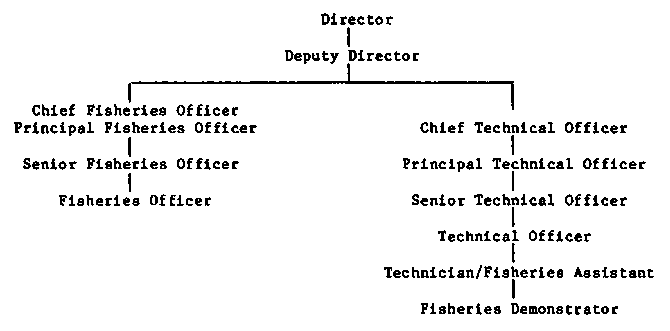 In the anglophone countries in the region there is a corps of fisheries personnel/staff within the Civil Service, and aquaculturists are assimilated into this corps. In most francophone countries, the exception being Senegal and only recently Cameroon, there is no special corps for fisheries staff. They are recruited within the existing corps of workers in Waters and Forests, Veterinary, Animal Production, or Agriculture. However, in both systems the staffing is stratified or hierarchial in both a vertical and horizontal sense, For example, the typical structure is as follows: